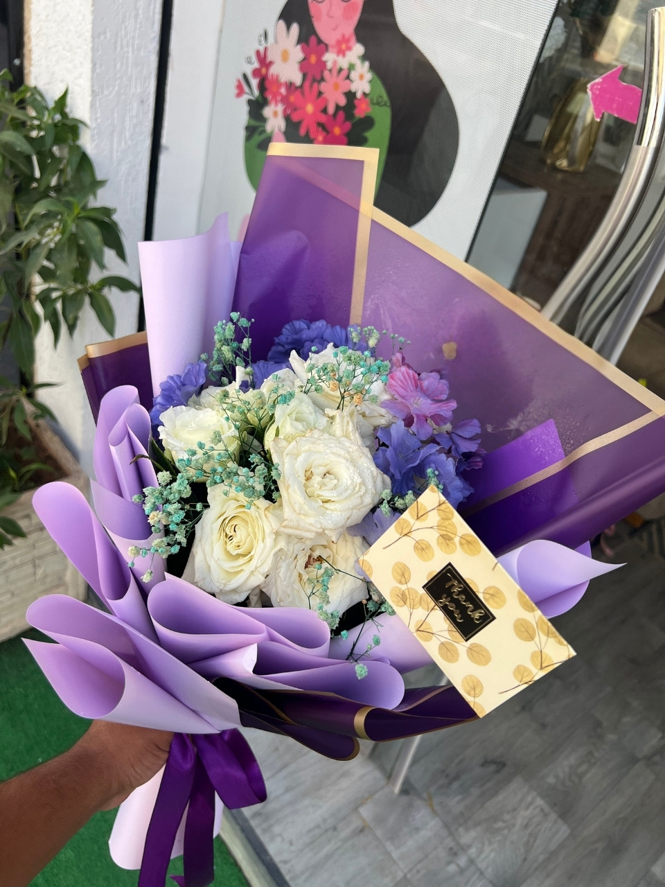 Bouquet de fleurs naturelles en mauve et blanc, une brise légère de pureté et de charme intemporel.
