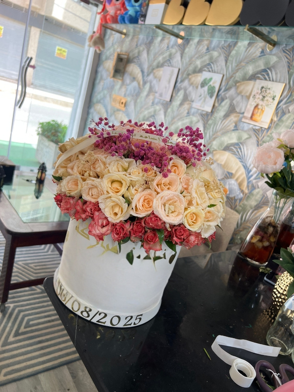 Un mélange harmonieux de fleurs pastel dans un box blanc éclatant, pour une allure chic et intemporelle