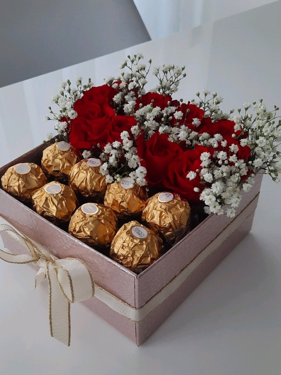 Coffret carré élégant, moitié chocolats fins, moitié fleurs rouges, pour un cadeau chic et plein de passion.
