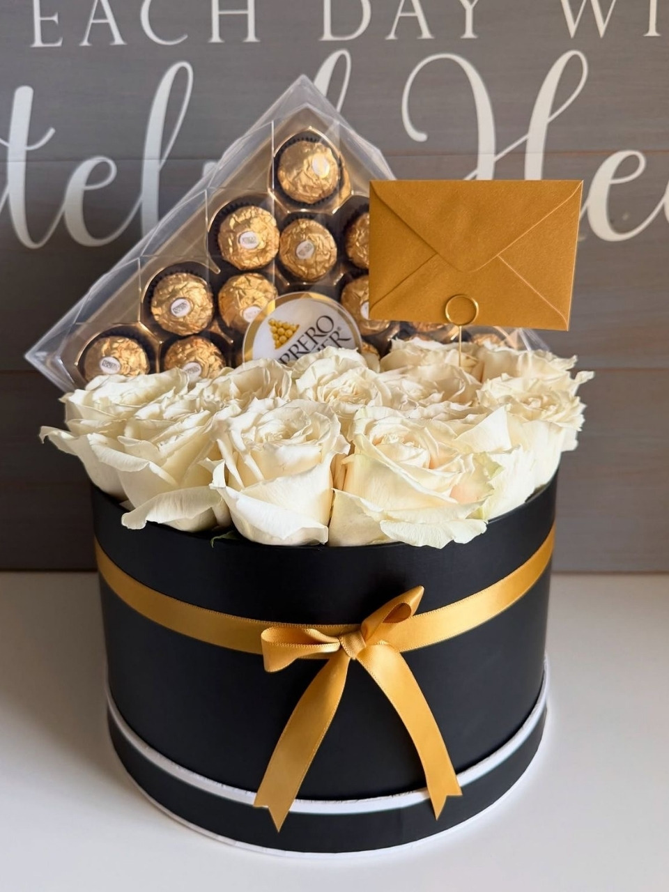 Coffret rond élégant, composé de fleurs blanches délicates et d’une généreuse sélection de Ferrero, pour un cadeau raffiné et gourmand.