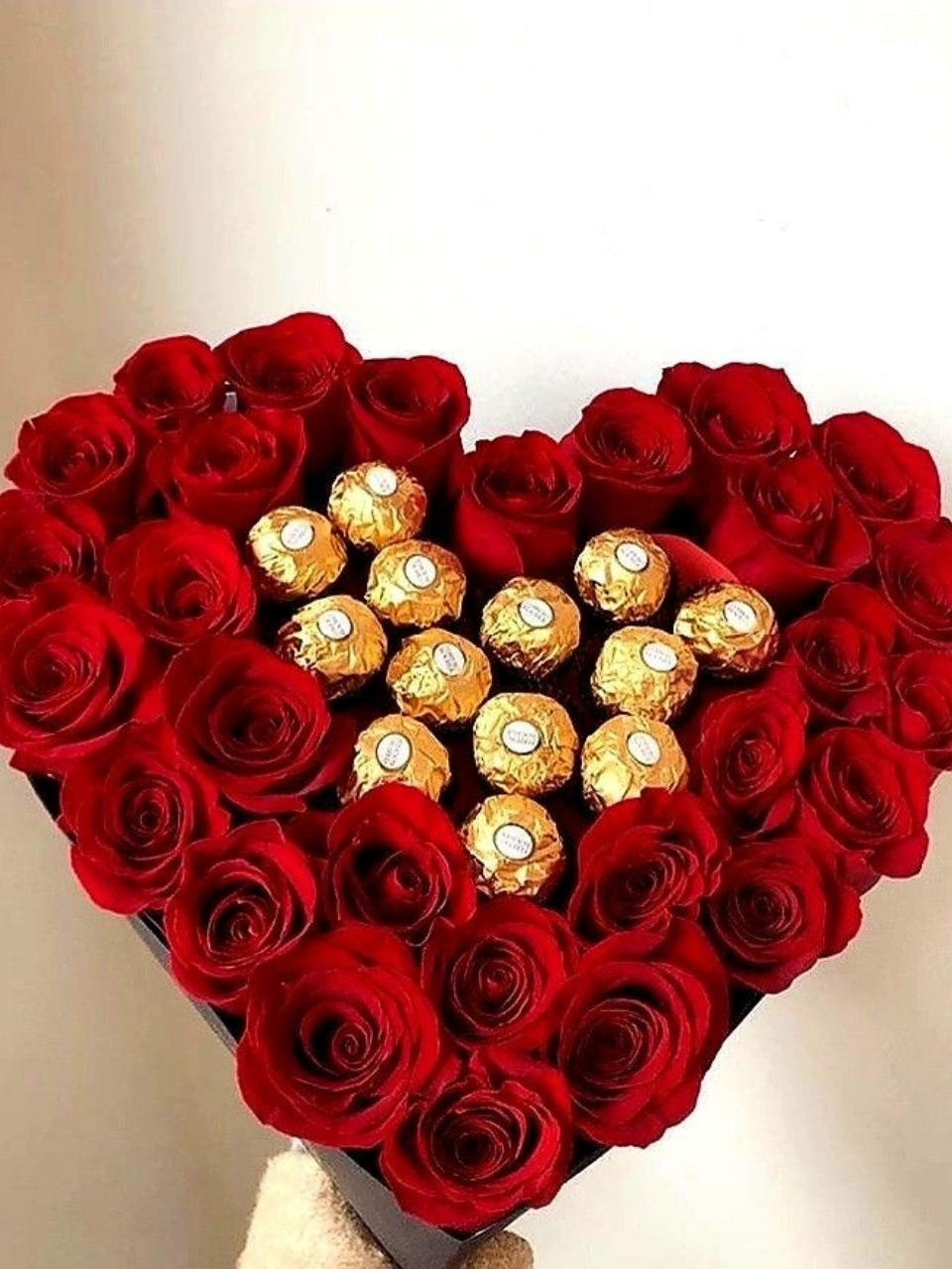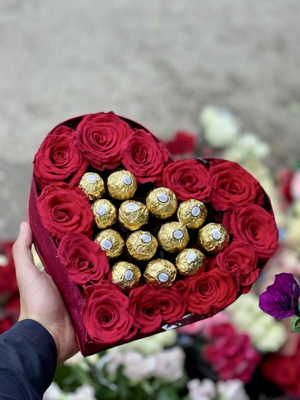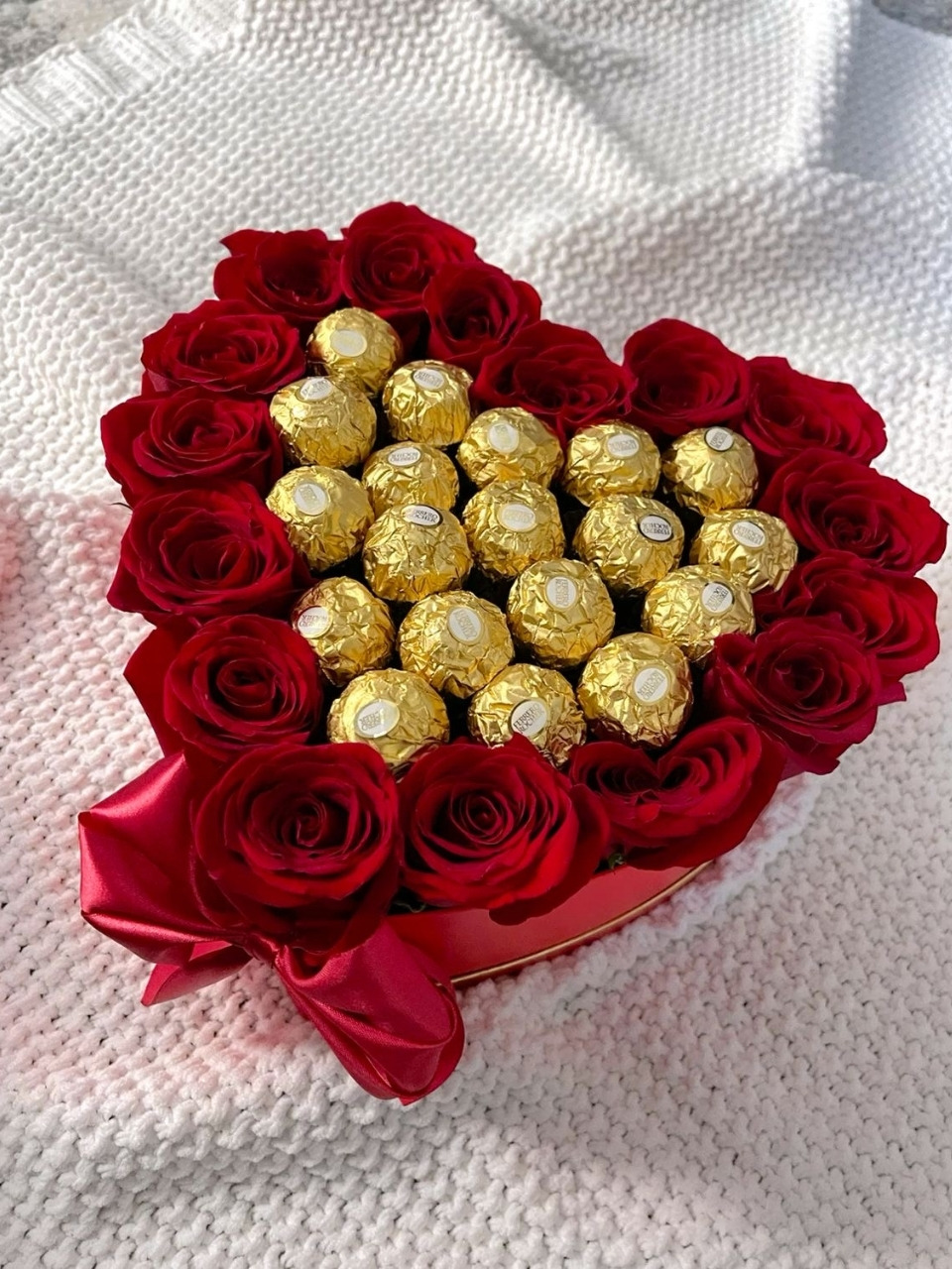 Coffret cœur rouge avec roses et Ferrero, symbole de passion et douceur