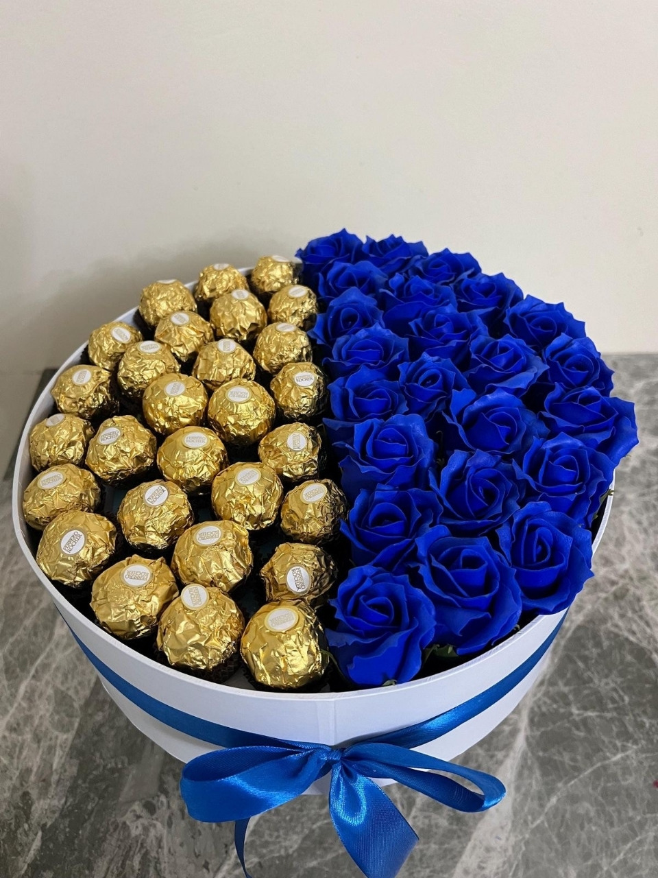 Coffret rond blanc, moitié fleurs bleues, moitié Ferrero, pour un cadeau tendre et élégant.