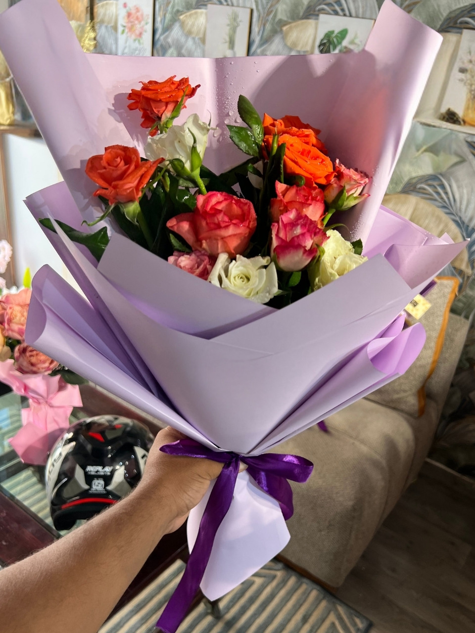 Des fleurs naturelles multicolores dans un voile mauve, une combinaison magique qui respire la gaieté et la grâce.