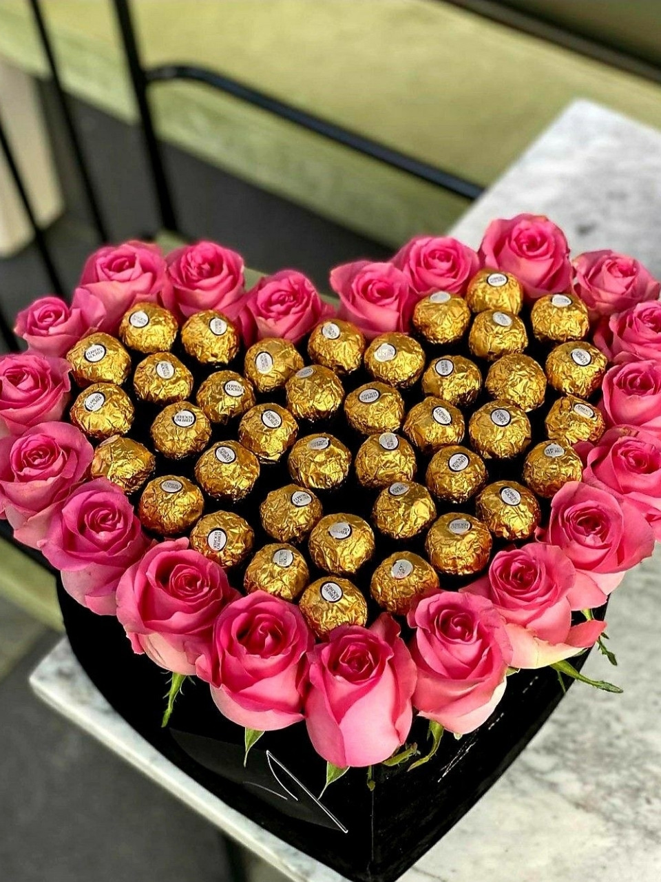 Coffret cœur rempli de Ferrero et de fleurs roses délicates, pour un cadeau tendre, gourmand et romantique