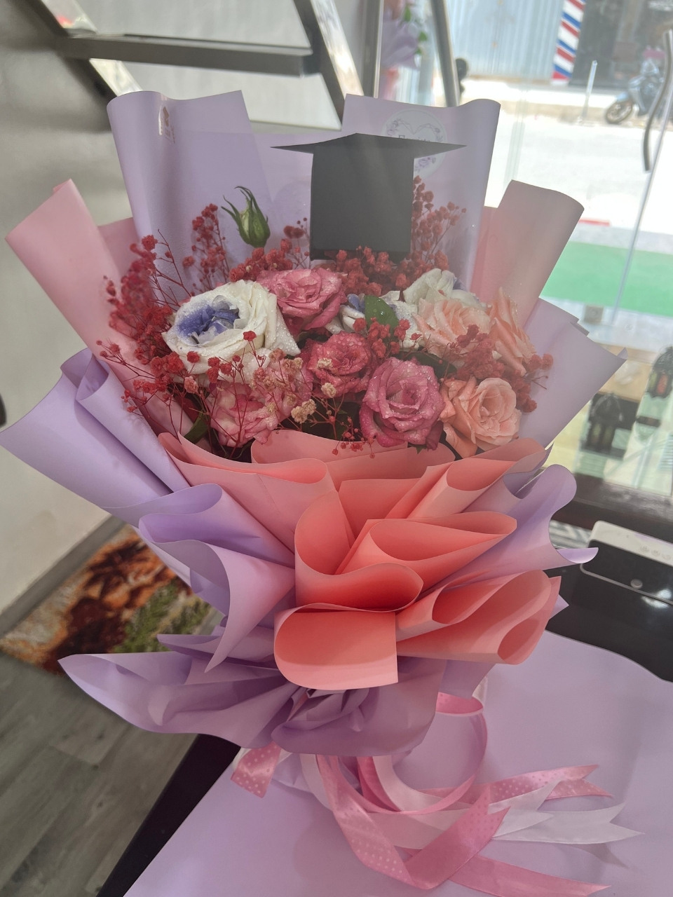 Fleurs naturelles aux tons rose et mauve, un bouquet qui célèbre la victoire et la persévérance avec douceur et grâce.