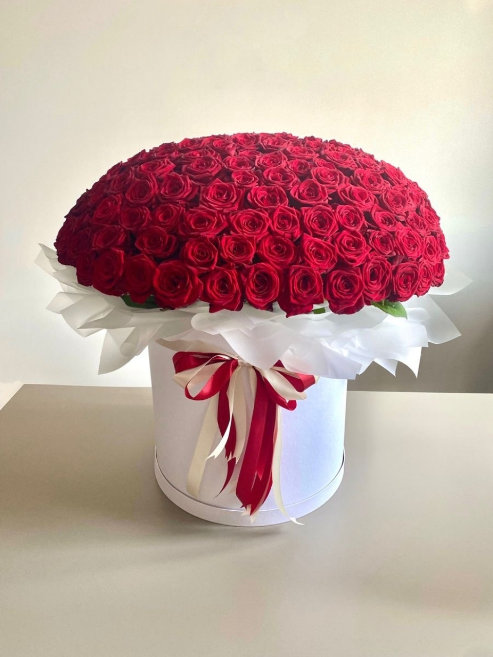 Coffret blanc délicat, rempli de fleurs rouges éclatantes, pour un cadeau tendre et raffiné.